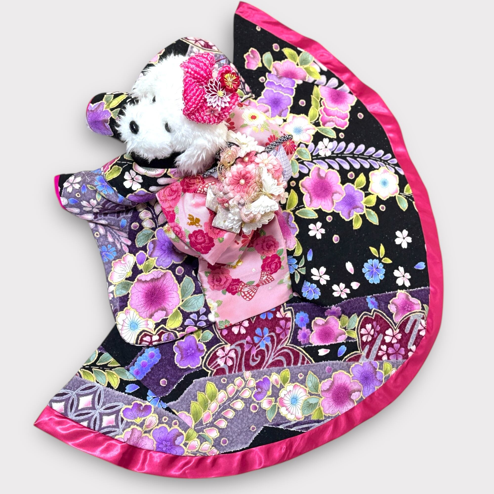 ✨桜の地模様に大輪の牡丹が咲く豪華な大振袖です✨ 華やかでかわいらしい大振袖♡ 合わせる帯によって現代風にも古典風にも応用できる柄がオススメPoint❤️ 帯は別売りでご用意しておりますので、お好みに合わせてコーデしてください✨ ❤️商品の特徴 特製の正絹で仕立てられたこのお着物は、 印象的な春の花が豪華に施された大振袖スタイル。 最上級の織物を贅沢に使った逸品になります✨ お引きずりデザインのため、まるで日本の伝統的な着物を身にまとったかのような美しさ 特別なお出かけやイベントの撮影にぴったりな一着です。 愛犬にこの素敵な着物を着せて、思い出に残る瞬間を演出してみませんか? ■カラー/サイズ/バリエーション ・カラー: 黒 ・サイズ: SM~L(胸囲35~43cm程度)サイズまでの小型犬用フリーサイズ(着付けが簡単なデザインです) ・半襟は軽く縫い付けておりますので、ご自身でコーデ可能です。 ■素材/製造国 ・素材: 正絹 ・製造国: 日本 ■お手入れ/取り扱い注意事項 ・ドライクリーニングを推奨します。 ・カビや虫を予防するために、直射日光を避け、防虫剤と一緒に保管してください。 ■発送・注文に関する情報や注意事項 ・ご注文後、通常3〜5営業日以内に発送いたします。 ・在庫状況により、発送が遅れる場合があります。 ■その他の情報や注意事項 ・実際の色味はモニターによって異なる場合があります。 ・細かな仕様や色合いは生産時期により若干異なることがあります。 ・髪飾りはモデルの私物になります(非売品) 特別なシーンに合わせたおしゃれを楽しんでみませんか? ご不明な点やお問い合わせは、ショップのお問い合わせからお気軽にどうぞ。