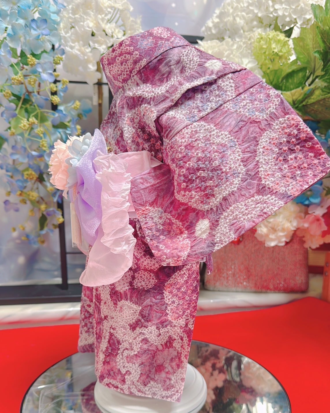 華やかな紫ピンクの花柄が目を引く、有松絞りの浴衣が登場です!