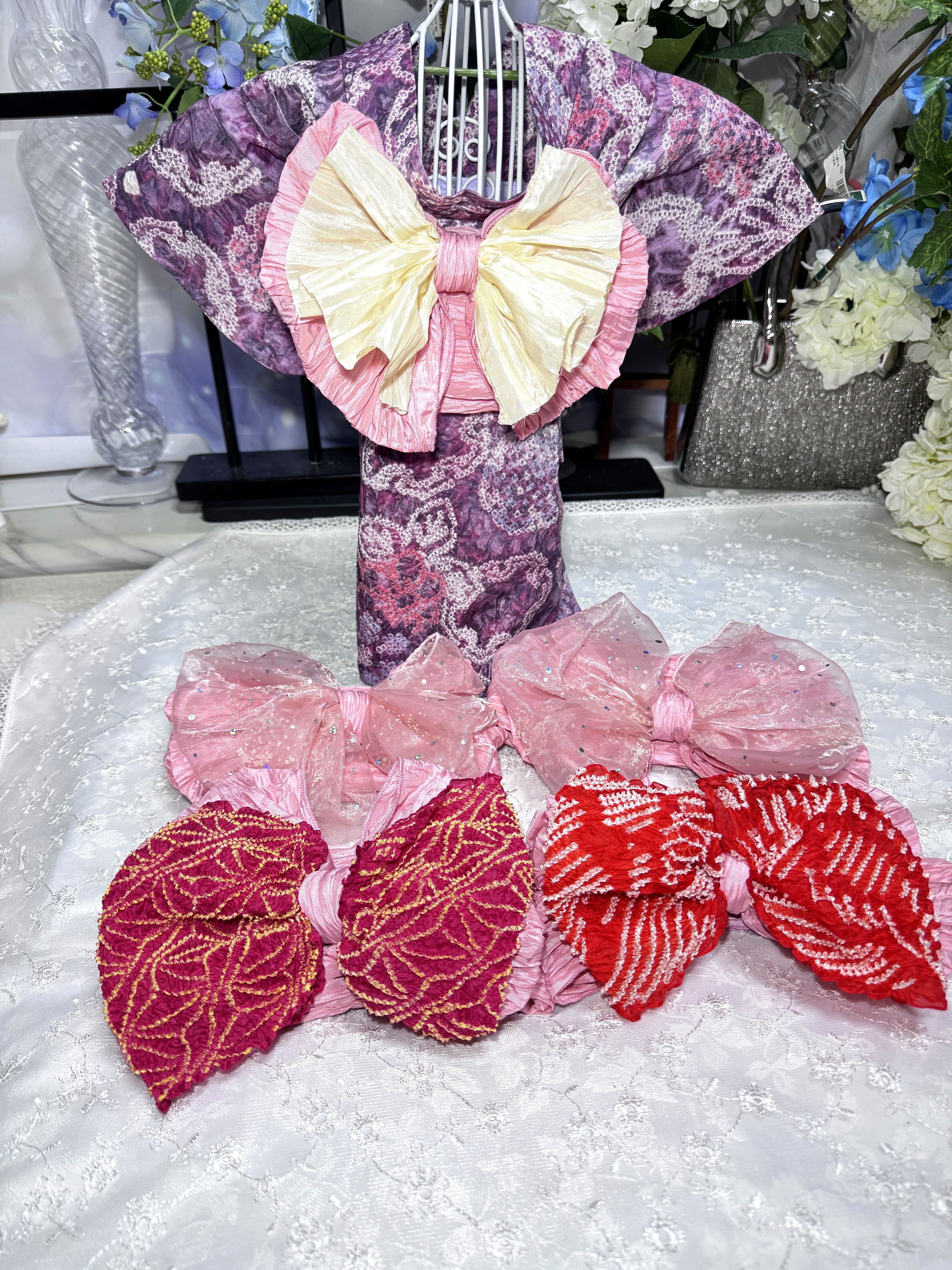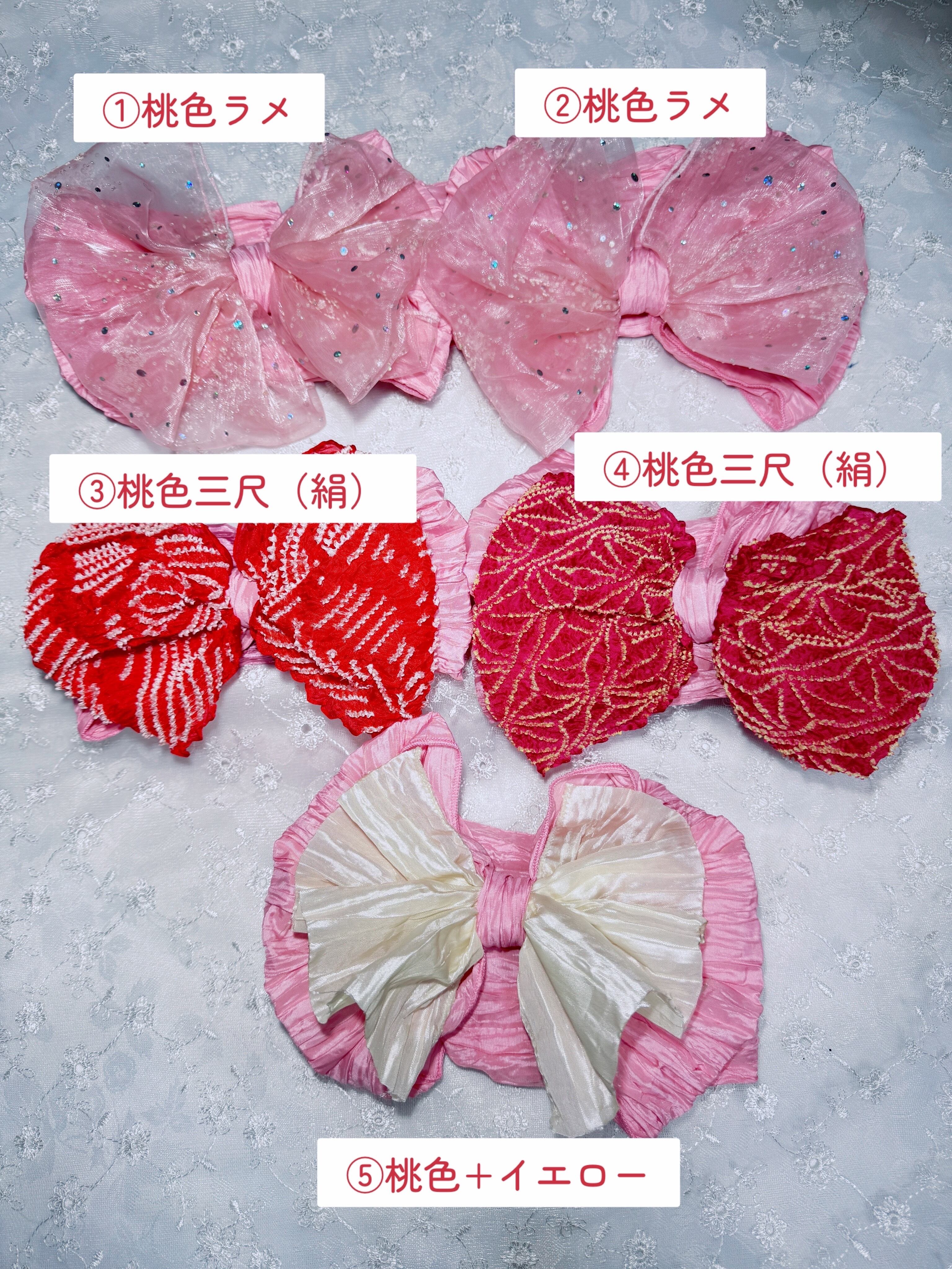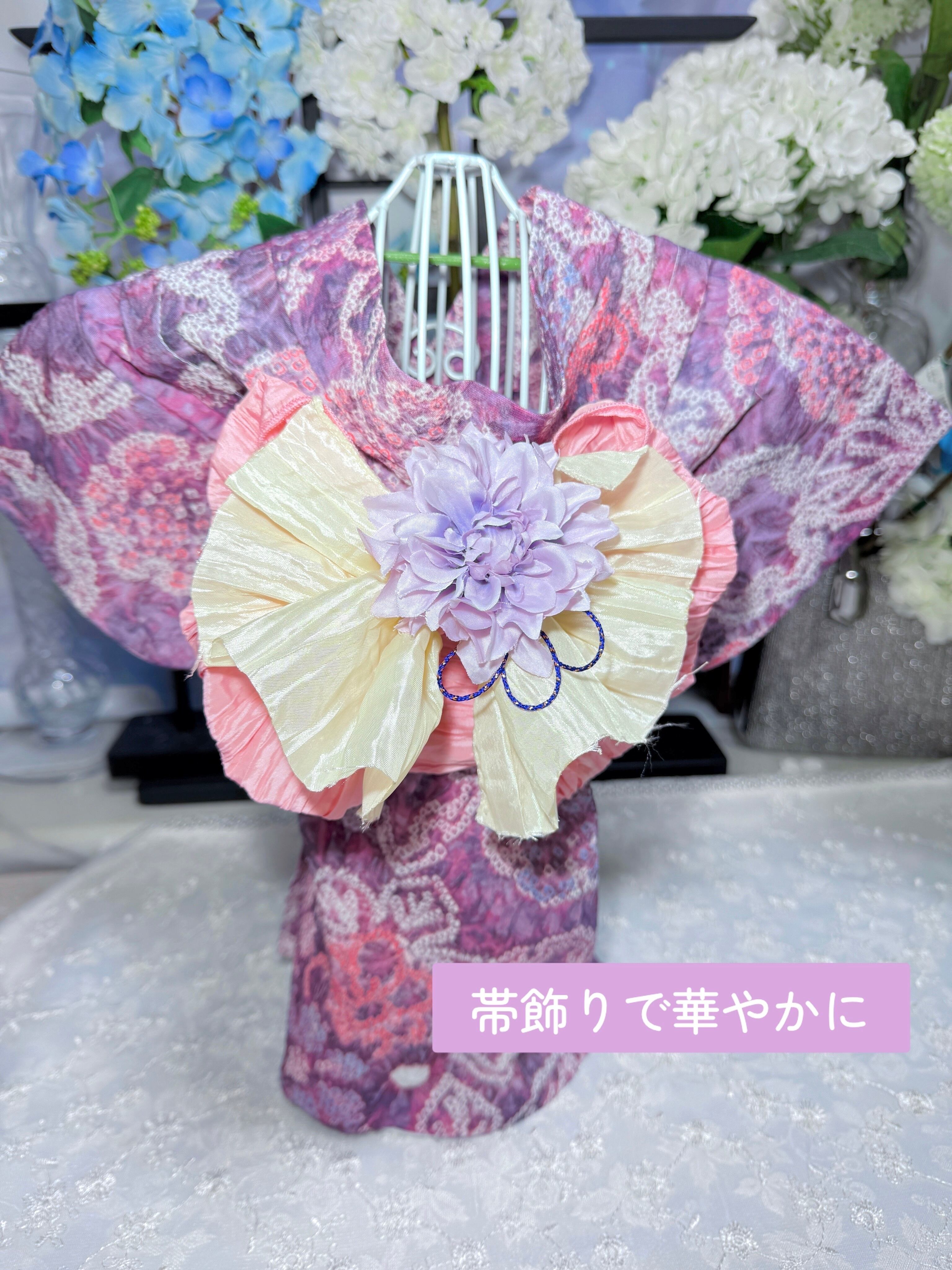 かわいいピンクのしわ兵児帯を使って1つ1つ異なるデザインで仕上げております。
