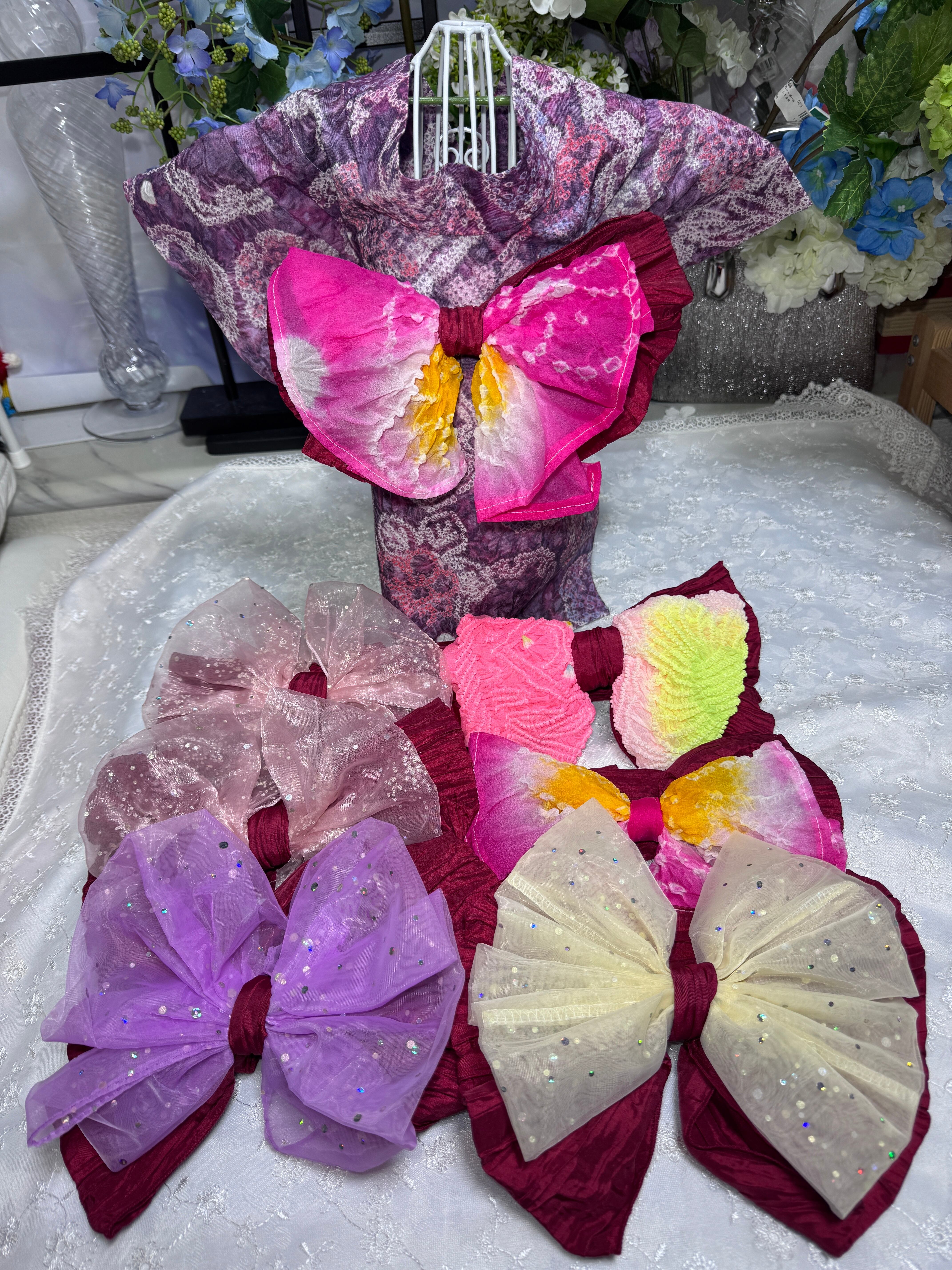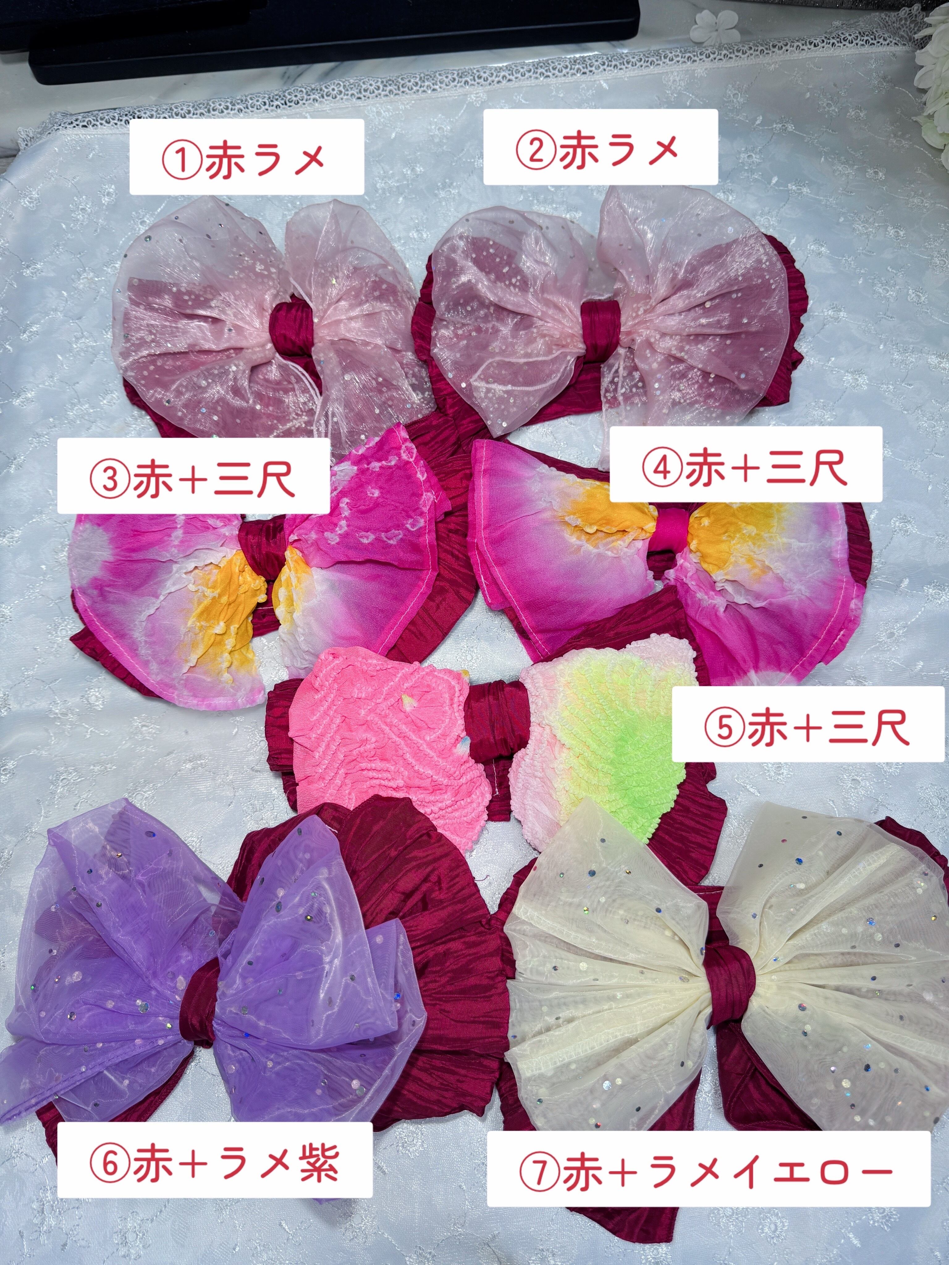 赤いしわ兵児帯を使って1つ1つ異なるデザインで仕上げております。