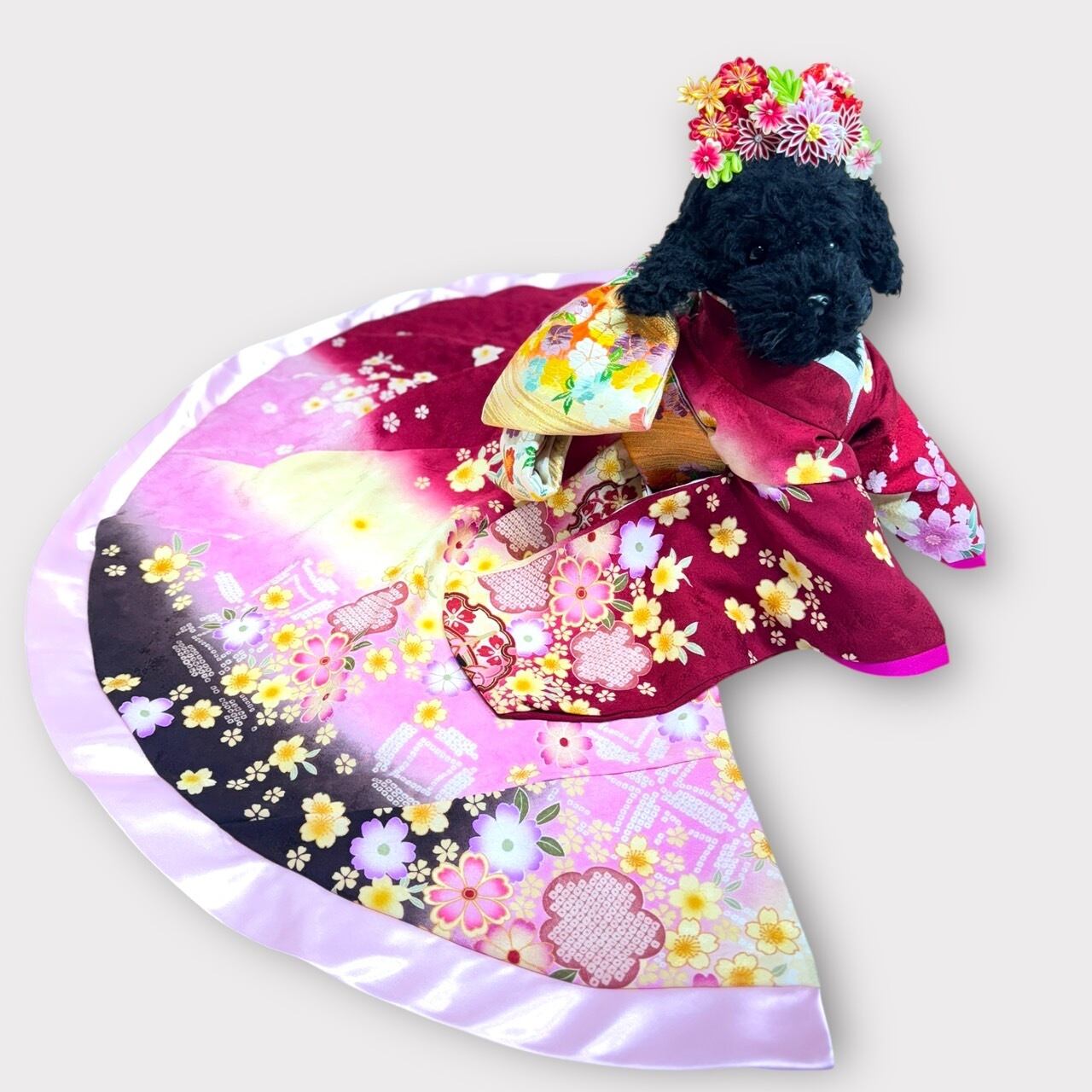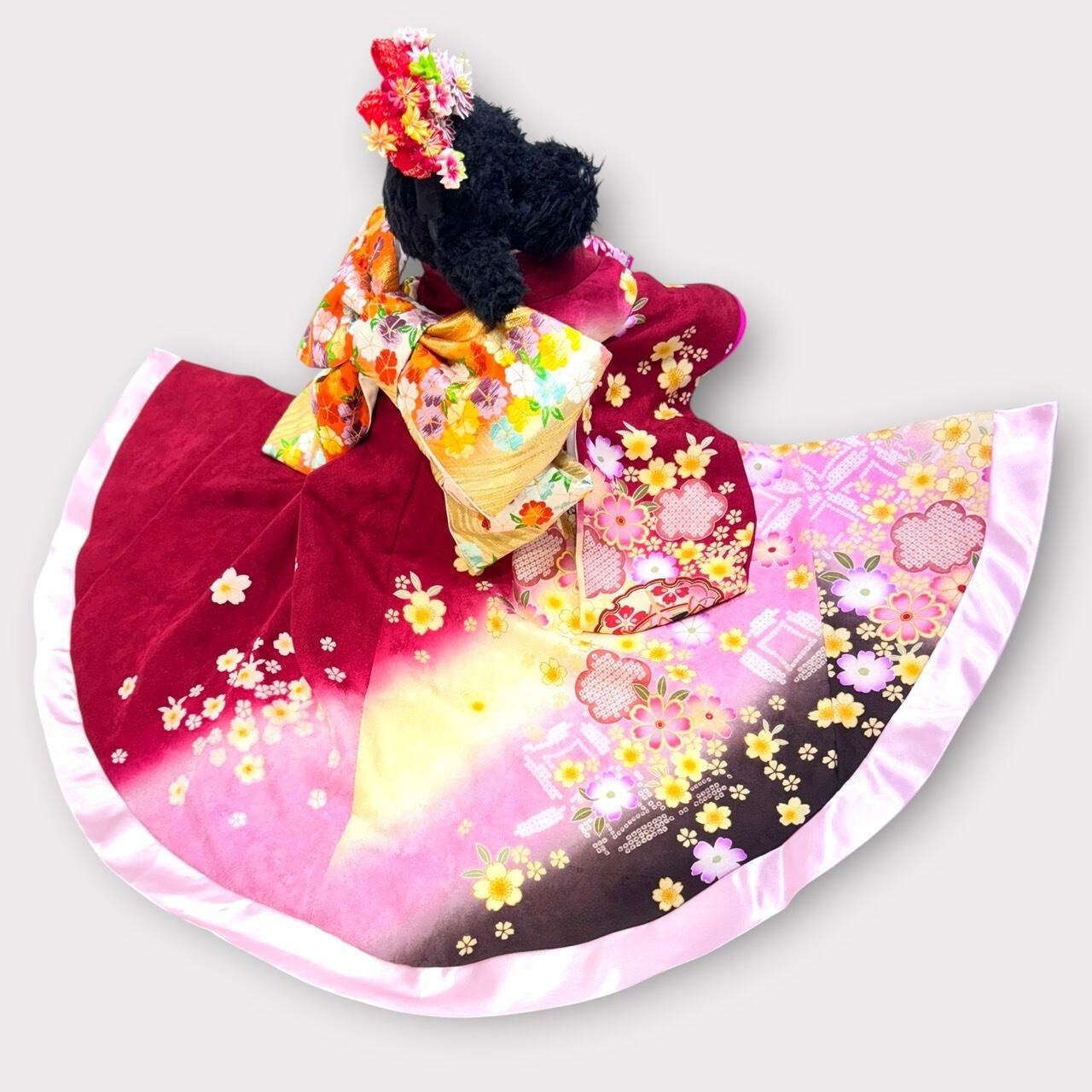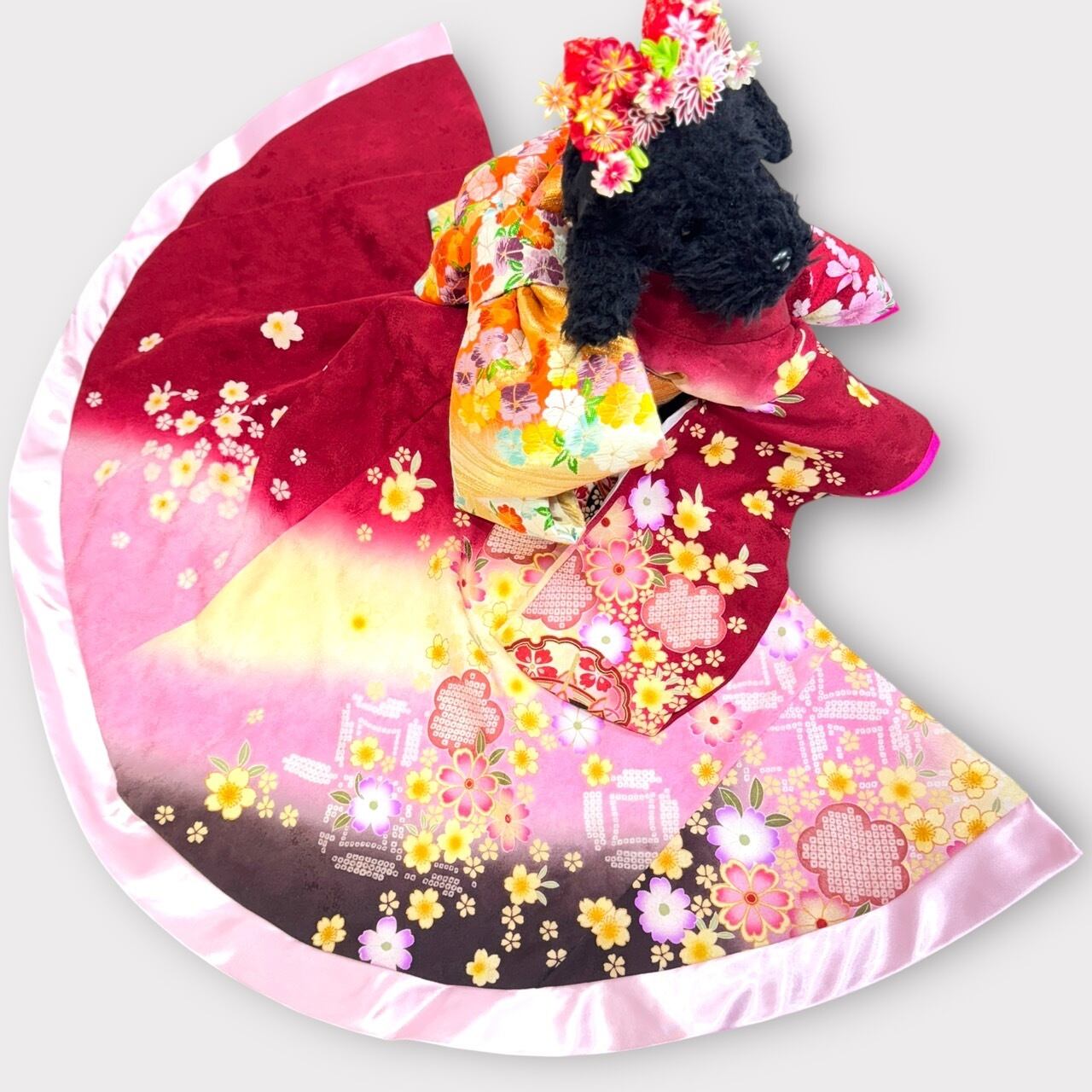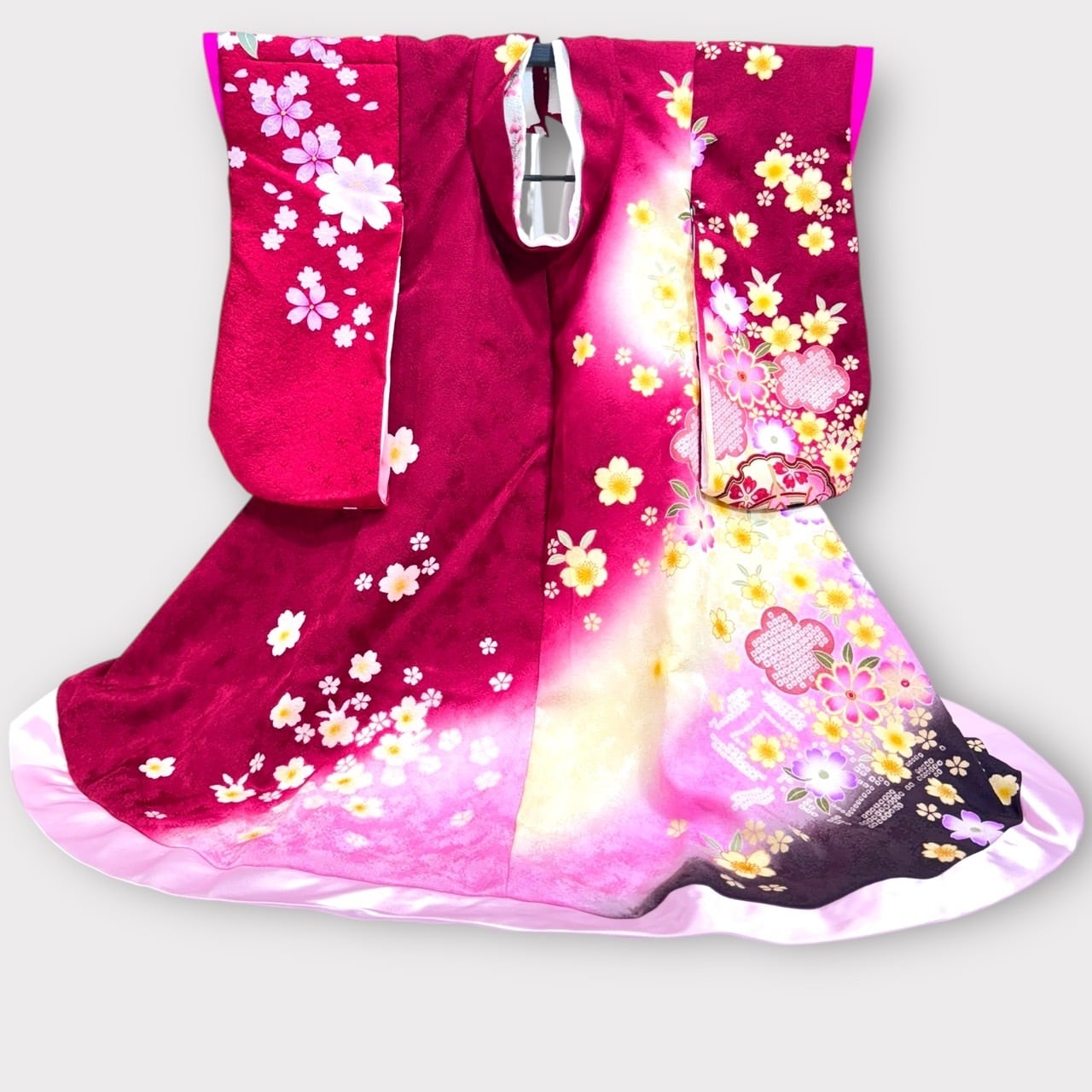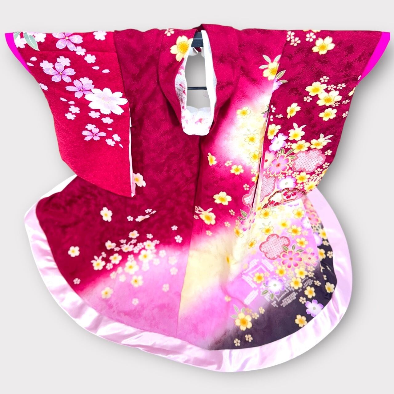 深紅に近い薔薇色と黄色の美しいグラデーションに優雅な桜の模様が映える一着です✨