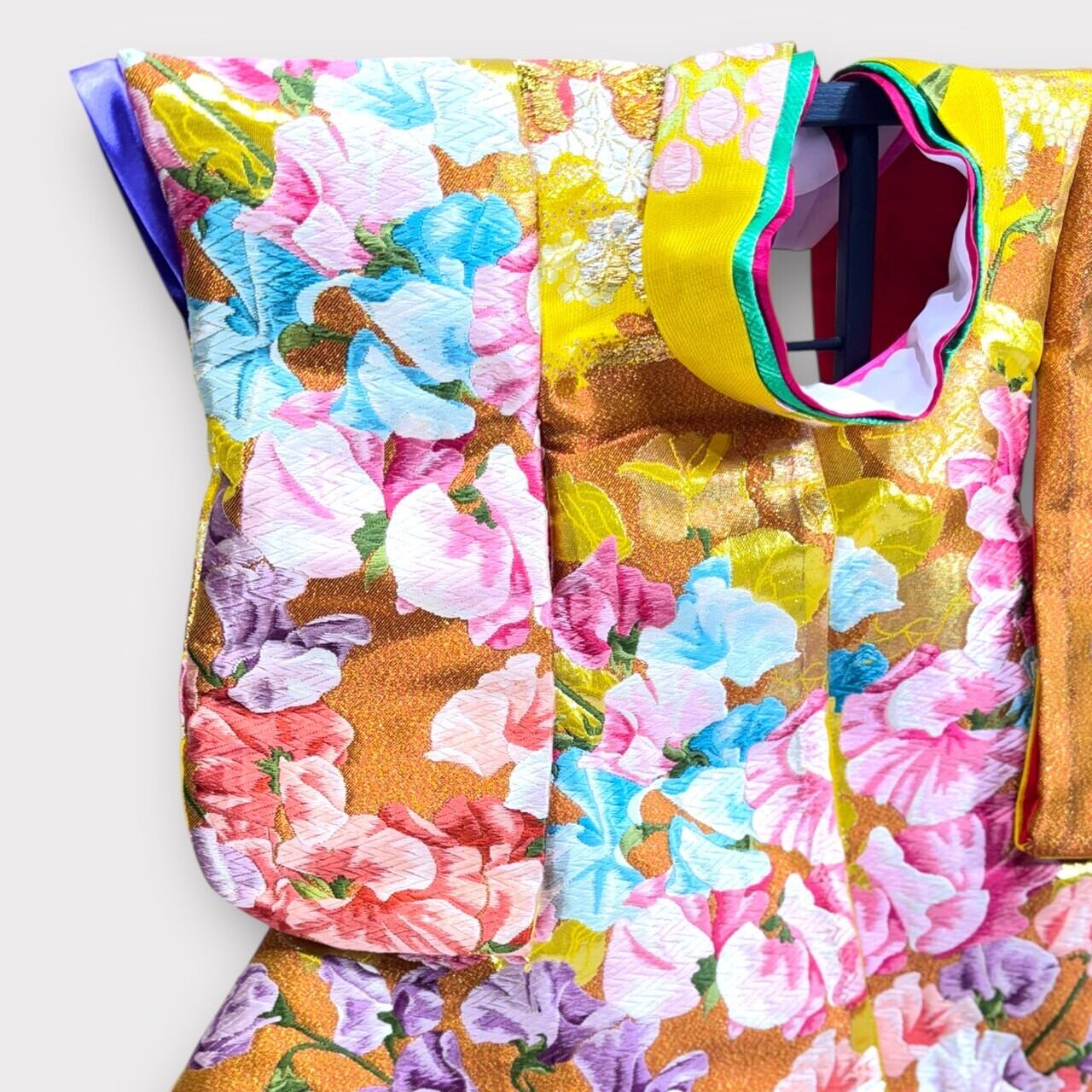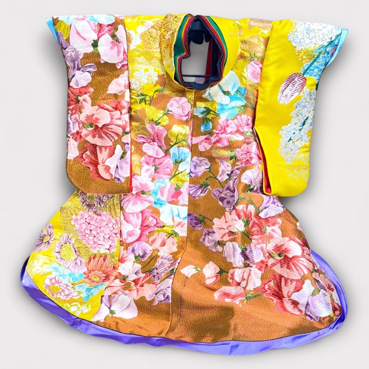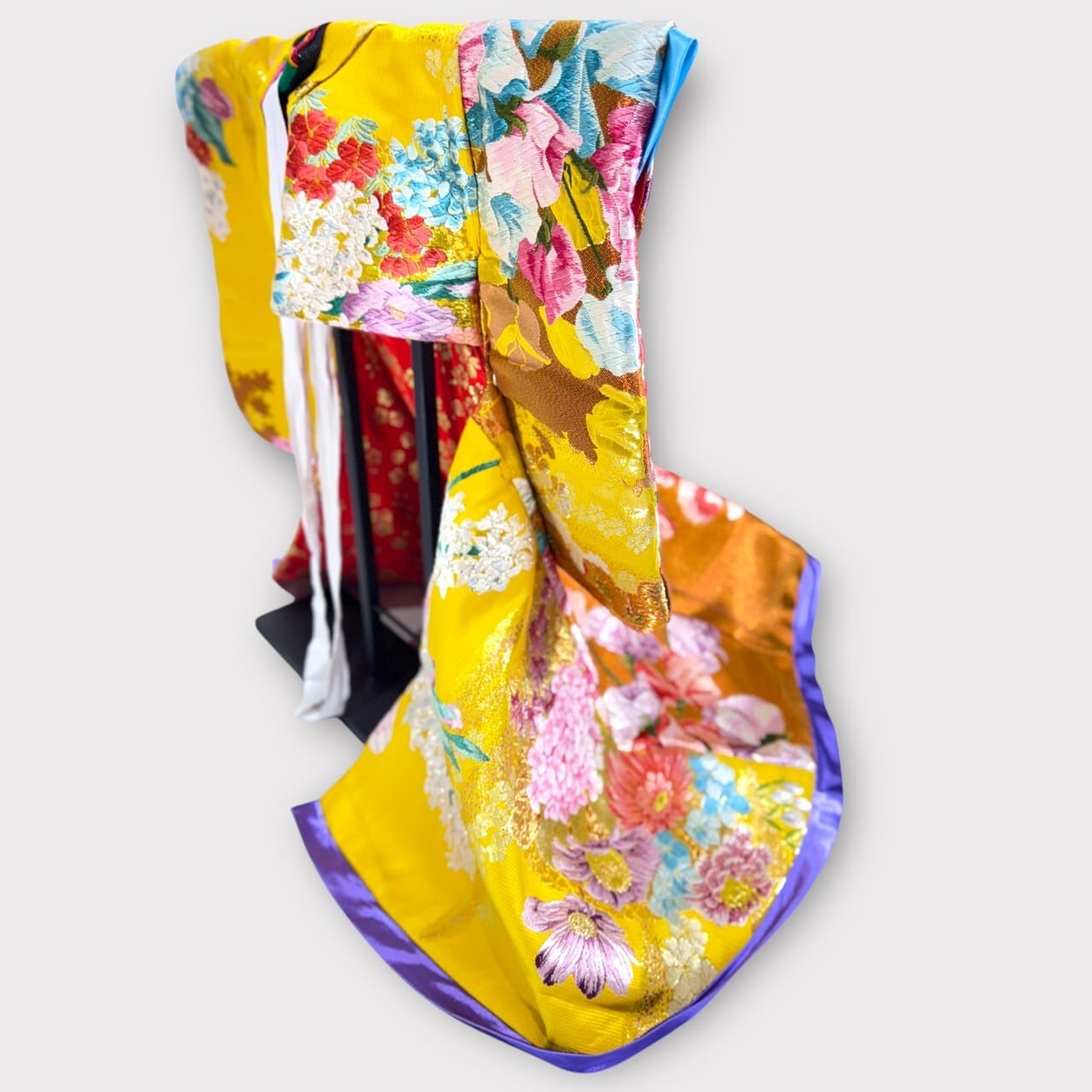 色とりどりのスイートピーに大輪の花々の刺繍が咲き乱れる見事な一着です✨