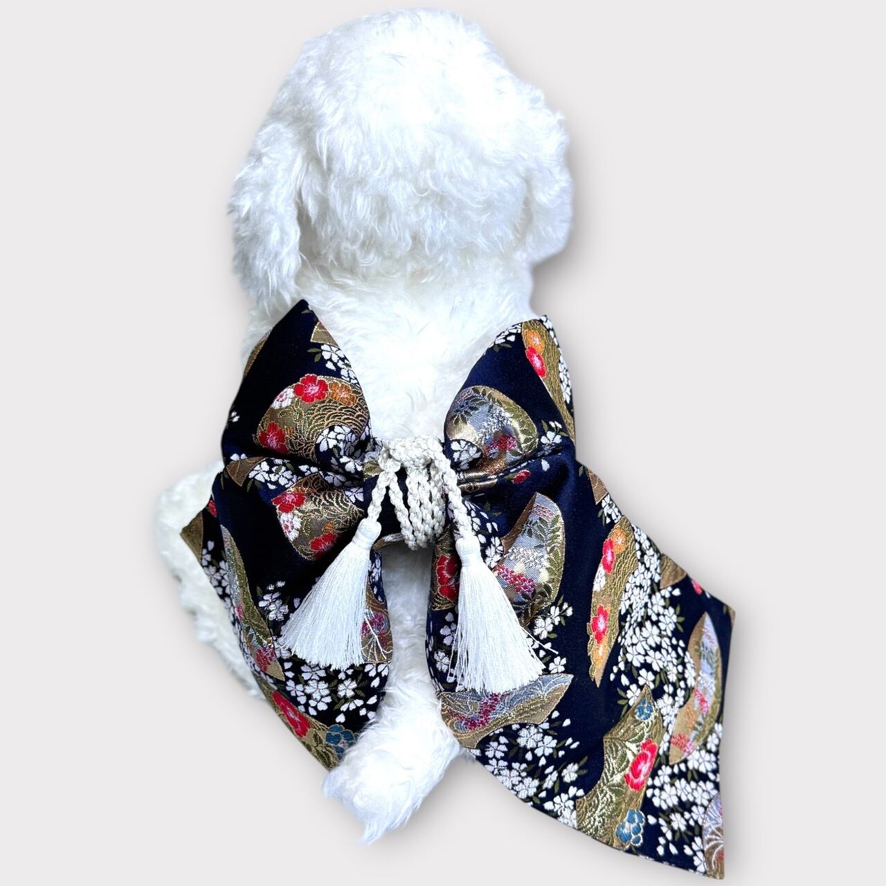繊細な金糸の扇が施され、扇の絵柄には彩とりどりの花が刺繍されているかわいらしい逸品。