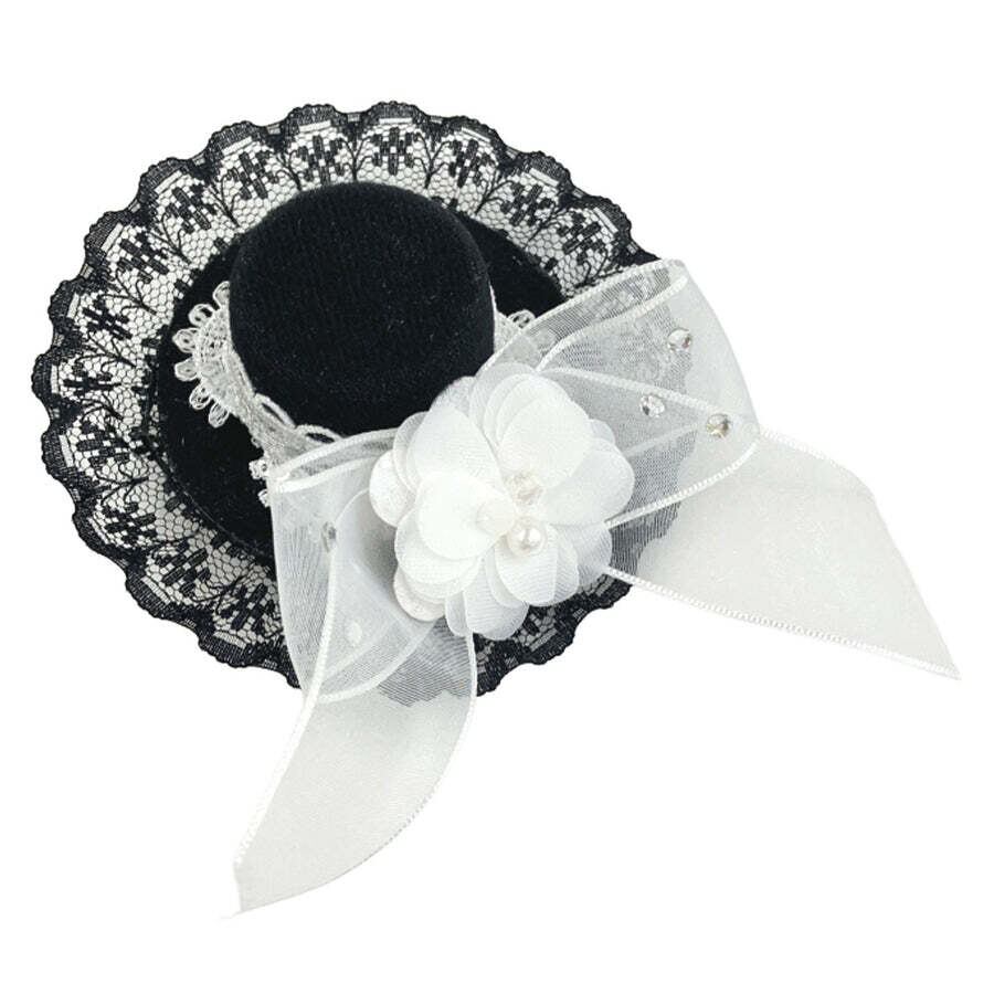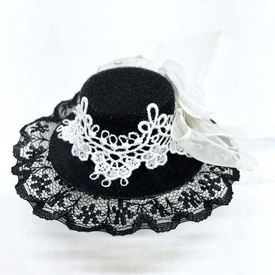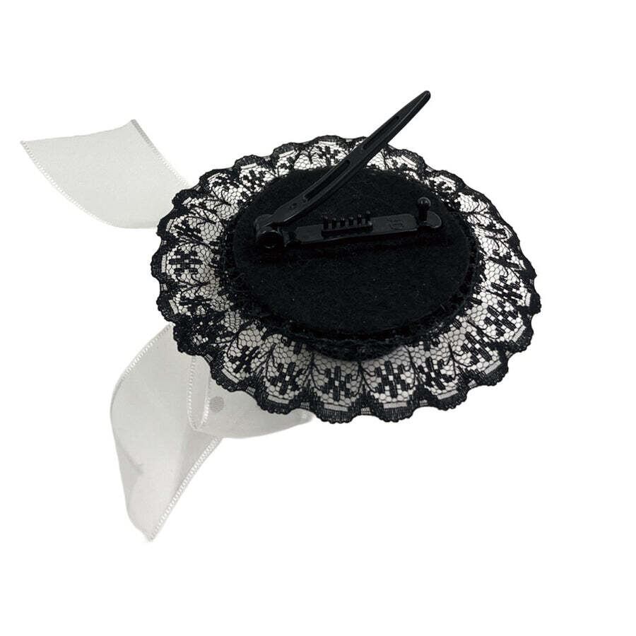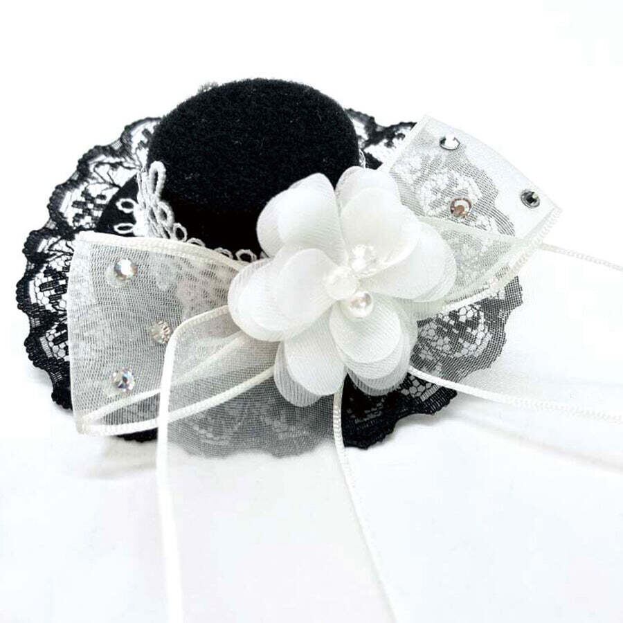 繊細なブラックレースにふんわりと咲く白いお花と軽やかなオーガンジーリボンをあしらったミニハット。