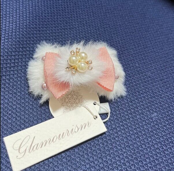 ふわふわファーにピンクリボン、真ん中には雪の結晶のようなビジューがあしらわれた
